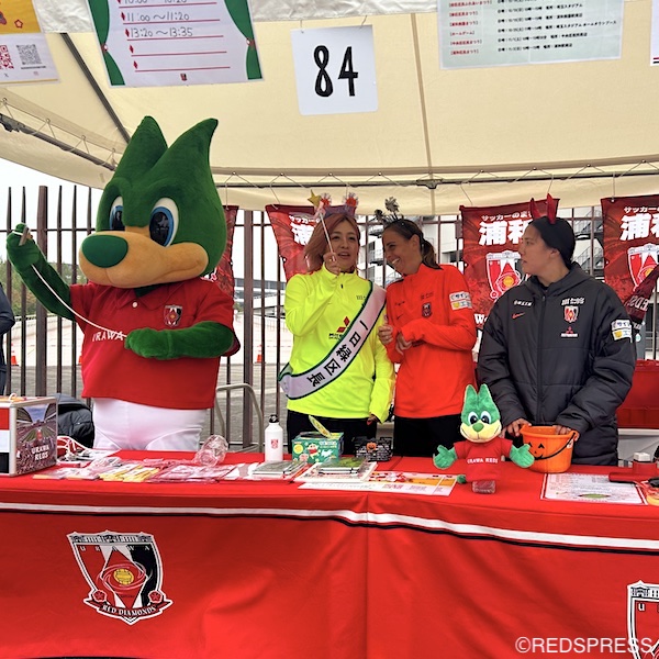 霧雨降る中、埼スタ南広場に設けられたステージには池田一日緑区長と、レディア、緑区マスコットキャラクター『緑太郎』、そして今シーズンに加入したタンチュリエ ローリーとサンシャイン フォンテスの2名も登壇した。その後、浦和レッズのブースへ移動し、会場に訪れた方々と、写真撮影またはサインの交流に臨んだ。