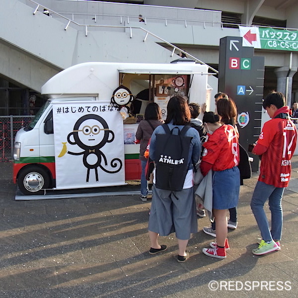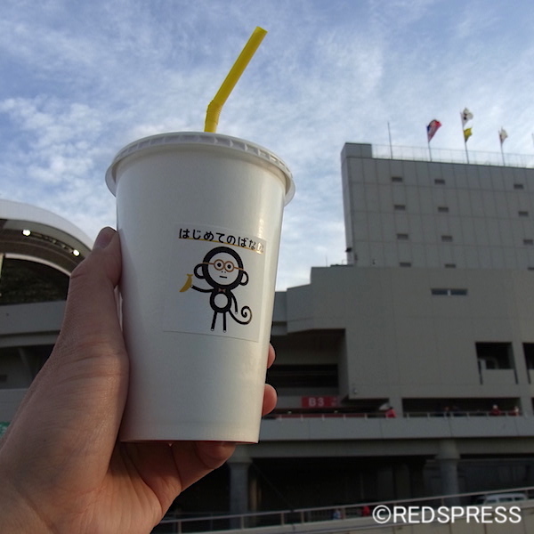 そんなことを考えながら浦和美園駅から歩いていたら、いつの間にか埼スタに到着していました。4月5日、横浜F・マリノス戦。北門内のネオ屋台村に直行します。お目当ては「はじめてのバナナジュース」です。