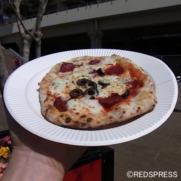 早速、スタジアム限定の「埼スタPIZZA」を注文してみました。お店の方が手作りの生地を石窯の中に入れて500℃の高温で一気に焼いてくれます。注文してからの待ち時間はおよそ2分だそうです。行列ができていても意外と早く自分の番が来ますよ。