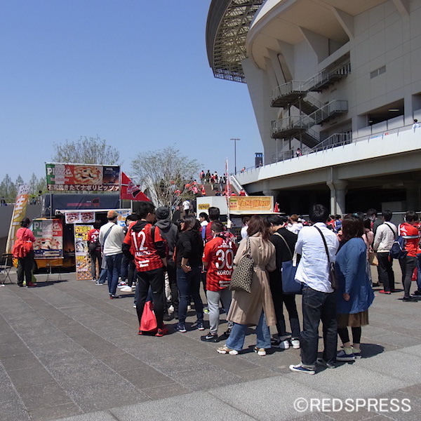 4月20日、ヴィッセル神戸戦。半信半疑のまま南門を通り抜けてメイン側に向かいました。お目当てはピッツァ専門店です。