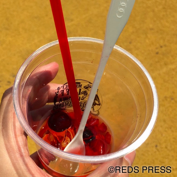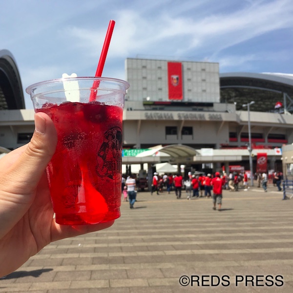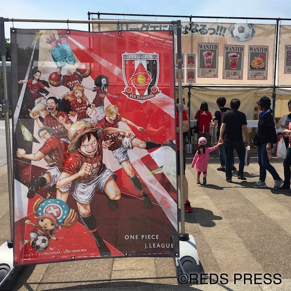 朝から取材をしていたせいで喉がカラッカラです。日差しがじりじり照りつけて、気温がどんどん上昇しているのが分かります。とりあえず何かを飲まないと倒れてしまう……。そんな時に『ONE PIECE』×『URAWA REDS』のパネルが目にとまりました。