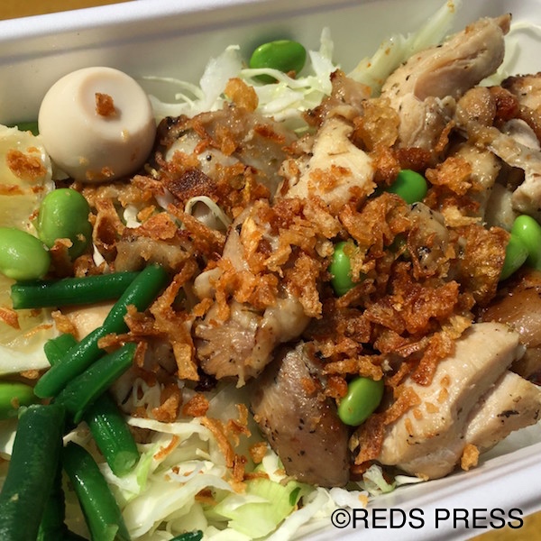 具材はオリジナルハーブミックスで味付けした鶏肉、キャベツ サニーレタス、枝豆、いんげん、うずらの卵、フライドオニオン。ソースは5種類あり、プレーン、タルタルソース、オニオンソース、葱バター醤油、ガーリックの中から選べます。私はプレーンにしてみました。野菜が盛りだくさんでさっぱりしていて、食べごたえもありオススメです。