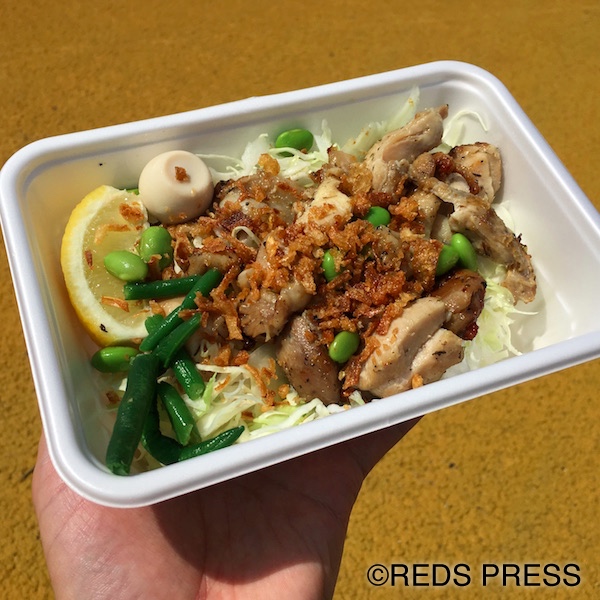 ところで皆さんは試合前にどこで食事をしていますか? 私はチキンステーキライスを買ったあと、近くのベンチに座ってみたのですが、直射日光のせいでびっくりするぐらい熱くなっていました。