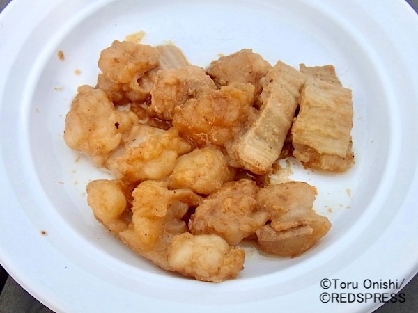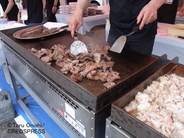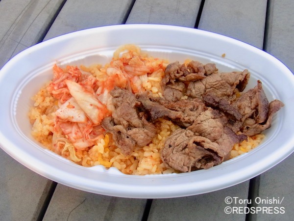 ブースの中では、ねじり鉢巻きをした森酒場のスタッフが、鉄板の上で大きな「タン」を豪快に炒めていました。真横にある別の鉄板では「ホルモン」を手際よくかき混ぜています。どれにしようか迷った揚げ句、かなりおなかがすいていたので、「カルビのせキムチ炒飯」と「ホルモン」の2品を注文してみました。