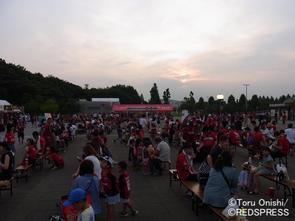 試合が終わると、ちょうど太陽が沈む頃でした。もう一度、南広場に行ってみると、森酒場の周りには試合の余韻に浸る大勢のサポーターが集まっています。天国にいる森さんに見守られながら、仲間たちと楽しく語り合える場所があるのは、幸せなことですよね。