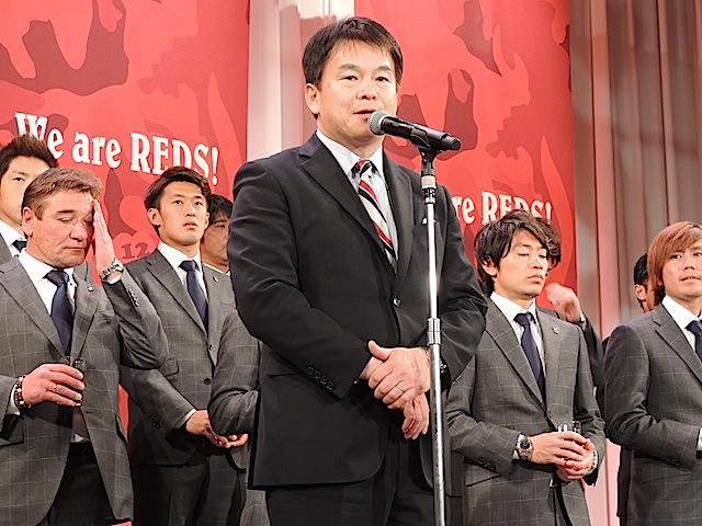 また、会の冒頭には、きょう付けで代表取締役社長を退任する、橋本光夫代表によるお礼のあいさつ、橋本代表からバトンタッチし、同職に就任する淵田敬三新代表取締役社長の登壇があり、淵田新代表は「レッズの力をもっともっと強くしなければいけない。強くて魅力あるチームにしなければいけない」と力強い言葉を語った。