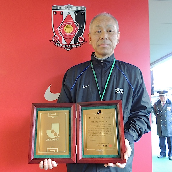 きのう3月8日(土)、埼玉スタジアム2○○2で開催された、J1第2節・サガン鳥栖戦のキックオフ前、ピッチでは「2013 Jリーグアウォーズ」で発表されたベストピッチ賞の授与式が行われた。埼スタは2005年の初受賞以降、2009年、2013年と三度、ベストピッチ賞に輝いている。