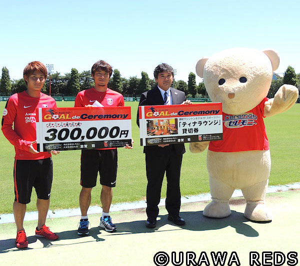 7月22日(水)、浦和レッズのオフィシャルパートナーである株式会社セレモニーは、練習終了後のピッチ前で「ゴールdeセレモニー贈呈式」を実施した。