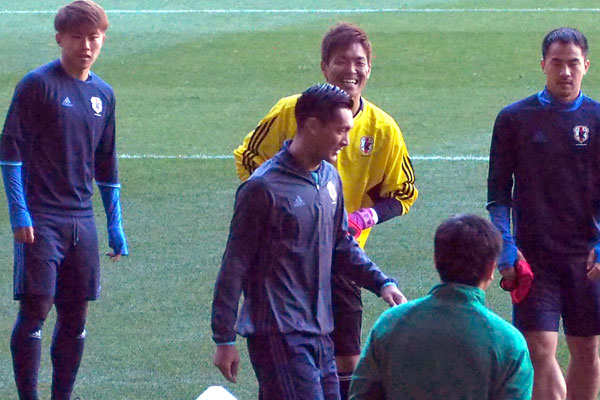 あす10月11日(火)に迫ったオーストラリア代表との大一番。前日となるきょう10日(月・祝)、日本代表は午後17時30分から試合会場となるドックランド・スタジアムで1時間ほどの練習を実施した。いつものように8対2のパス回しによるウオーミングアップでは、柏木陽介と西川周作、槙野智章の3人は仲良く同じグループでプレー。そして、きのう9日(日)までとは異なり、試合をあすに控えて「やるべきことはやった」という満足感と自信からか、チーム全体の雰囲気が明るくなっていた。もちろん左足首痛の岡崎慎司が初めて全体練習に参加したことも影響したかもしれない。
