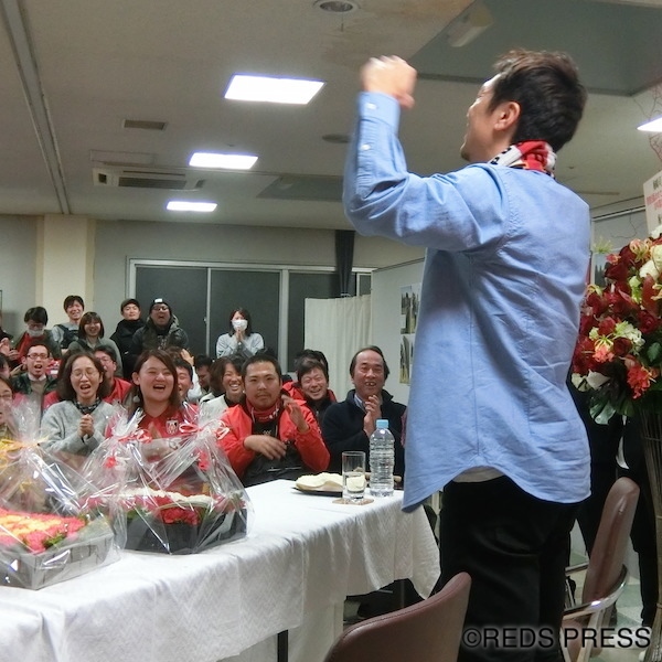 最後に、梅崎は「浦和レッズサポーターの皆さんと別れるのは辛い。ここに入れなかった方もいたし。1つだけ心残りなのは、去年、自分のチャントを歌わせることができなかったこと。このチームは特別。簡単なプレーではチャントは歌ってはくれない。何でなんだよ、と思った時期もあったが、それには意味があって、自分がプレーで皆さんに還元しないと、そして自分自身が気持ち良いプレーをしないと歌ってはもらえなくて、そこで初めて、みんなと大きな喜びを、チャントの大合唱で一緒に興奮を、感動を味わうことができるのだなと僕は思っていた。去年、絶対に歌わせてやると思っていたが、それが叶わず残念で悔しい。でも、ユニフォームの色は変わるが、そこで皆さんが『ウメらしいプレーだな』と、楽しく、ワクワクするようなプレーを絶対に見せる。数多く見せるので、その時は、心の中ででも歌って下さい。本当に10年間、ありがとうございました」と涙を流しながら想いを口にし、深々と頭を下げた。