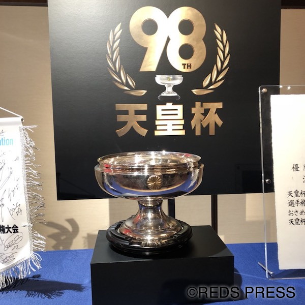 『CUP WINNERS』と書かれたビッグボードの前に選手たちが揃うと、大きな拍手に包まれた。淵田敬三代表や今季限りで選手生活から離れる平川忠亮、1年間キャプテンを務めた柏木陽介らがマイクの前に立ち挨拶。また、祝勝会では手渡された天皇杯などが展示され、出席された皆さんは嬉しそうに写真撮影を行っていた。