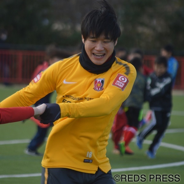その後、レッズランドの人工芝グラウンドに場所を移して行われた『ふれあいサッカークリニック』では、寒風のなか、小学生94人が参加。選手とともにリフティングなどの基本技術を学び、さらにはゲームを楽しんだ。