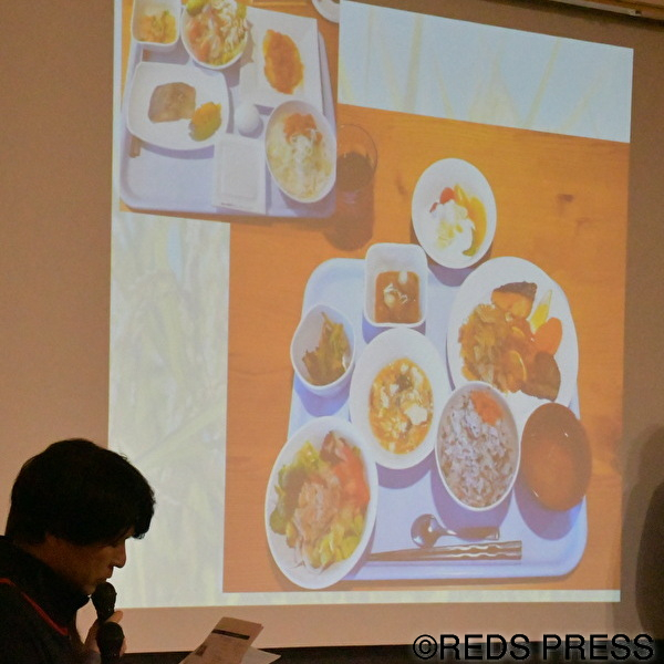 大原のクラブハウスで試合前日に提供されるビュッフェ形式の食事メニューがスライドで映し出される。消化しやすく、試合中にエネルギー不足とならないようなメニューが用意され、特に野菜や果物などが豊富に提供されていることが分かった。