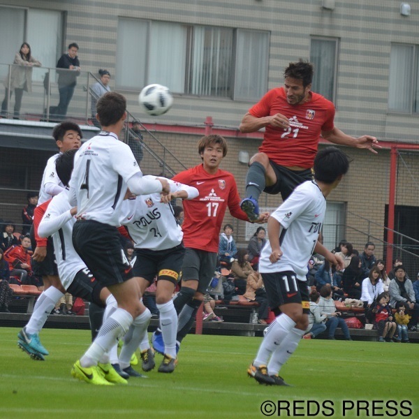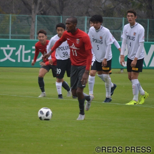 浦和レッズは11月4日(日)、大原サッカー場で浦和レッズユース(以下・浦和Y)と午前11時から45分×2本 のトレーニングマッチを実施した。試合は0−0で迎えた2本目12分にFWアンドリュー・ナバウトが決めて、先制する。その2分後にはMFマルティノスがPKを決めて、追加点を挙げた。さらに35分、マルティノスがダメ押しの3点目を決め、トップチームが3−0で勝利した。