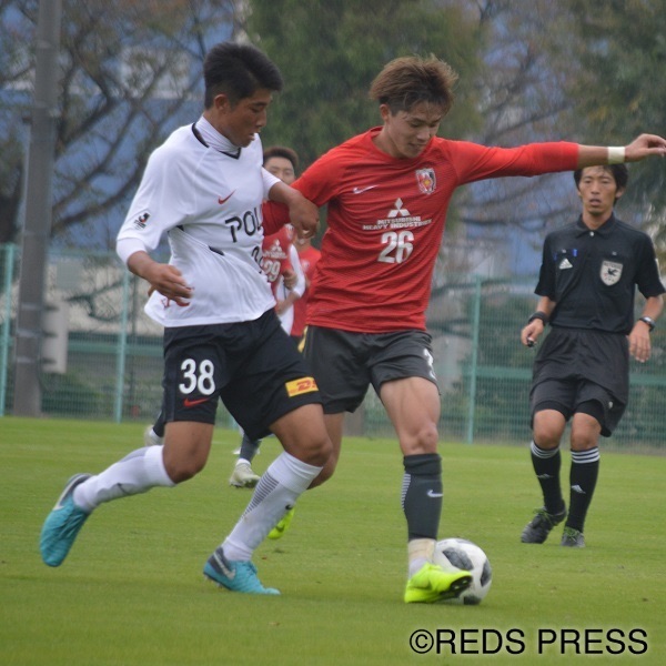 AFC U-19選手権インドネシア2018からきのう帰国したばかりの荻原拓也が早速、トレーニングマッチに先発。1本目は3バックの左センターバック。2本目は左サイドでプレーした荻原は、チーム2点目となるPKのキッカケを作った。