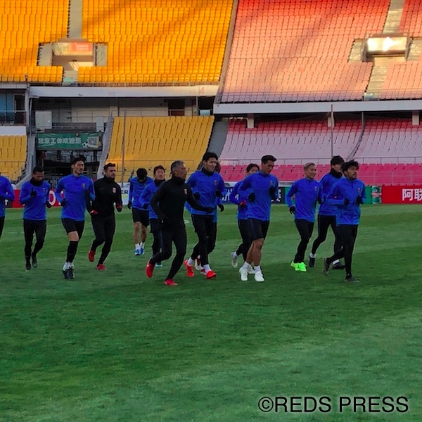 浦和レッズは3月12日(火)、北京工人体育場でAFCチャンピオンズリーグMD2・北京国安戦の前日練習に臨んだ。いつものレギュレーションどおり、冒頭15分のみの公開。ジョギング、ボール回し、パス交換などを行うと、メディアはピッチを離れるように指示が出された。