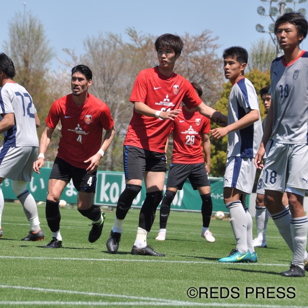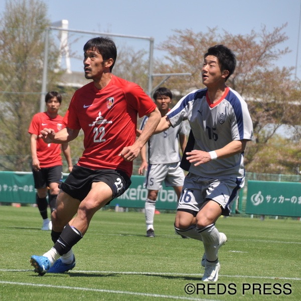1本目、浦和レッズは4バックで臨む。アンカー気味にポジションを取る阿部勇樹がCBの間に入りボールを配給し、1トップに入ったアンドリュー ナバウトが攻撃の矢となった。