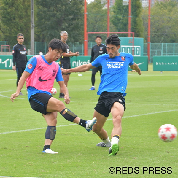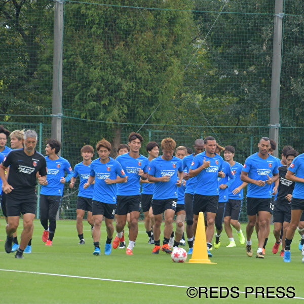 午前10時20分にピッチに出てきた選手たちは、ランニング、ステップ、ストレッチ、ヘディングをこなす。対人メニューに入る前に状態を上げていった。