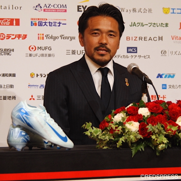 開始直前までふせられた会見場には、浦和レッズに移籍して初めてゴールを決めた時の写真など4枚のパネルと、背景には、左に加入当時のユニフォームと背番号30の文字。右には、今シーズンのユニフォームと背番号30の文字。テーブルには、赤と白のバラとNIKEジャパンから贈られたNIKEのスパイク、『マーキュリアル ヴェイパー16 エリートFG』に名前と2005-2024の刺繍がなされた特別モデルが飾られていた。
