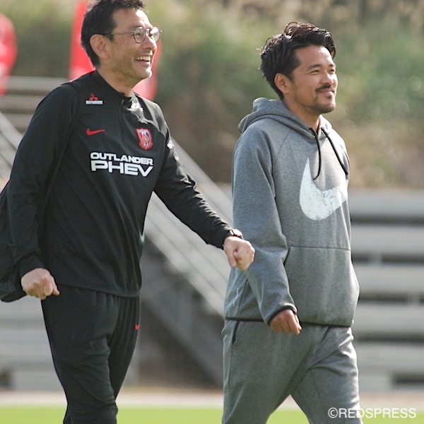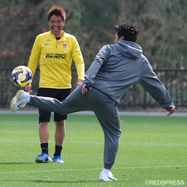 数日前から、キャンプには興梠慎三さんの姿がある。週末には、チームの激励に訪れたパートナー企業の皆さんと共に行動していた。ジャケット姿が多かったが、きょうはナイキのセットアップ姿で、全体練習後には宇賀神友弥さんらと、そしてGKチームとリフティングでボールに触れた。
