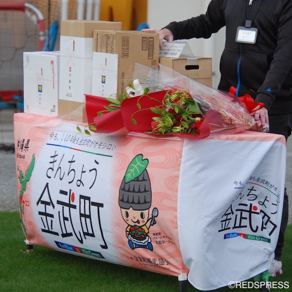 花束贈呈には、琉球銀行金武支店の方など協力会から2名が立ち、マチェイ スコルジャ監督、関根貴大が受け取った。さらに陣中見舞いとして、金武町や沖縄県、協力会、宿泊地から6品[銘酒泡盛『龍』/銘酒泡盛『松藤』/沖縄県産アグー豚『金アグー』/お菓子詰め合わせ/タコライス(レトルトパック)/さんぴん茶/ミネラルウォーター]がチームに贈られた。