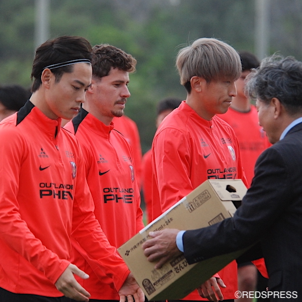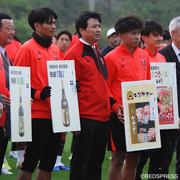 今年も歓迎の挨拶に臨んだのは、金武町の仲間一町長ではなく、浦和レッズサポーター“金武町支部”の金城司副町長。昨シーズンを、文字通りの激励叱咤で振り返りつつ、短期決戦となる明治安田J1百年構想リーグにむけて「今年も金武町フットボールセンターで、技術はもちろんのこと、組織力、また、マチェイ監督の指導のもと、戦術もみんなで確認して、大きく前進して頂けると期待しております」と期待を寄せ、「We are REDS!」の言葉で締めた。