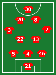 MF:13鈴木啓太・22阿部勇樹・7梅崎司・3宇賀神友弥・8柏木陽介・20李忠成