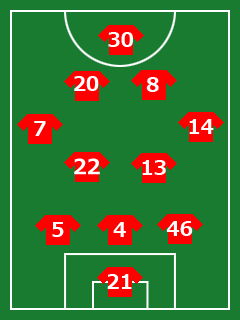 MF:14平川忠亮・13鈴木啓太・22阿部勇樹・7梅崎司・8柏木陽介・20李忠成